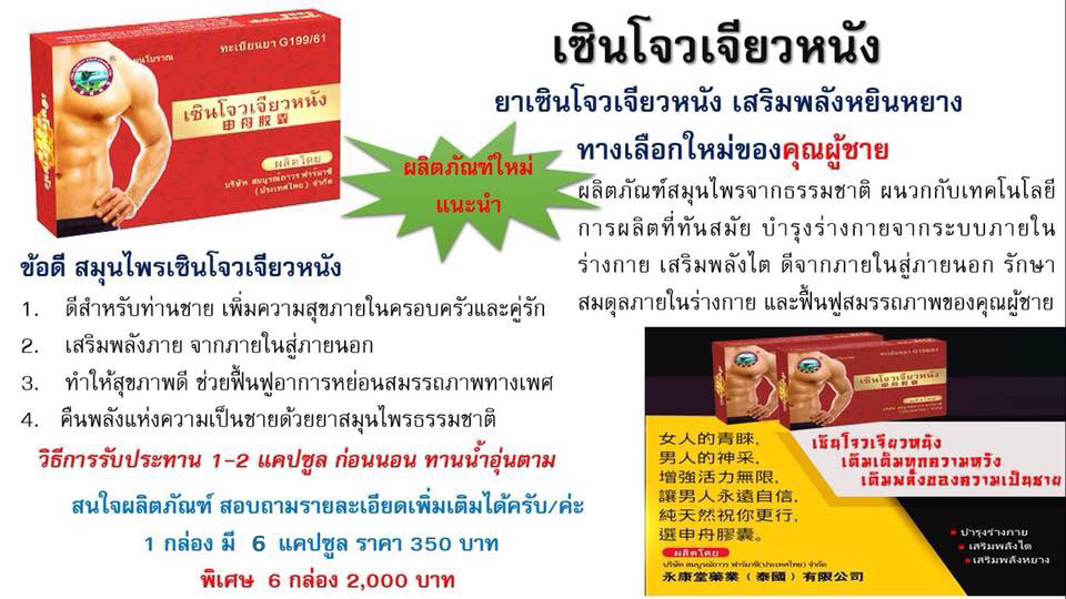 เซินโจวเจียวหนัง บำรุงร่างกาย นวัตกรรมใหม่สำหรับคุณผู้ชาย ด้วยการคัดสรรคุณประโยชน์ของสมุนไพรแท้จากธรรมชาติ ผนวกกับเทคโนโลยีชั้นนำของการผลิต ด้วยคุณสมบัติที่ดีที่มีอยู่ใน “ เซินโจวเจียวหนัง ” เป็นการบำรุงร่างกายที่ดีมาจากระบบภายในร่างกาย เสริมพลังไต ทำให้สุขภาพดีจากภายในสู่ภายนอก ทำให้ร่างกายของคุณผู้ชายมีสุขภาพแข็งแรง อีกทั้งยังช่วยฟื้นฟูการหย่อนสมรรถภาพ คุณผู้ชายจะรู้สึกสดชื่นกระปรี้กระเปร่ายิ่งขึ้น ระบบไหลเวียนเลือดลมภายในดียิ่งขึ้น เมื่อคุณมีกิจกรรม จะมีการตื่นตัวที่เร็วขึ้น ยืดระยะเวลาการหลั่ง ทำให้คุณผู้ชายมีกิจกรรมได้อย่างมั่นใจ และได้พบกับช่วงเวลาแห่งความสุขมากยิ่งขึ้น ด้วยยาบำรุงร่างกาย “ เซินโจวเจียวหนัง ”